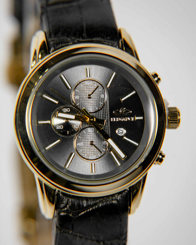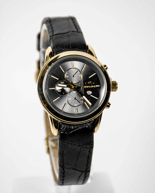بند این ساعت از جنس چرم میباشد رنگ آن مشکی و مقاوم است همچنان قاب این ساعت از جنس استیل میباشدو رنگ ثابت است، قفل این ساعت ضامن دارمیباشد