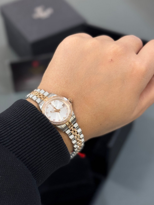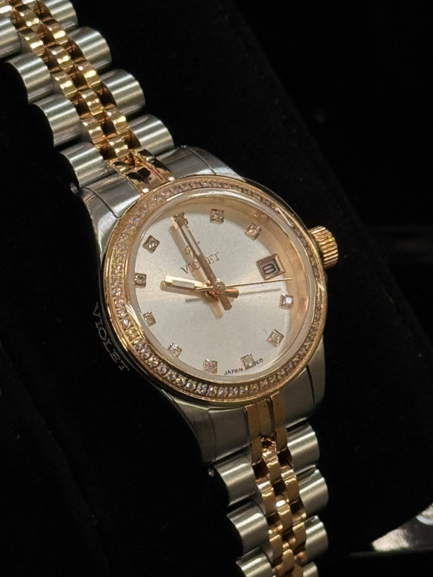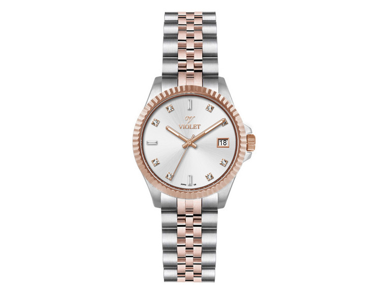 ساعت مچی زنانه ویولت با بند و قاب استیل و موتور ژاپنی در یک رنگ در گالری موجود است . ایندکس های این ساعت با نگین کار شده و نمایشگر روز شمار تاریخ دارد.گ