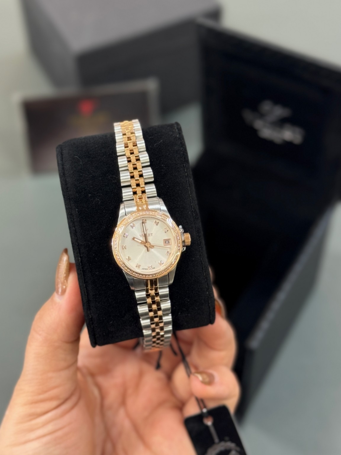 ساعت مچی زنانه ویولت با بند و قاب استیل و موتور ژاپنی در یک رنگ در گالری موجود است . ایندکس های این ساعت با نگین کار شده و نمایشگر روز شمار تاریخ دارد.گ