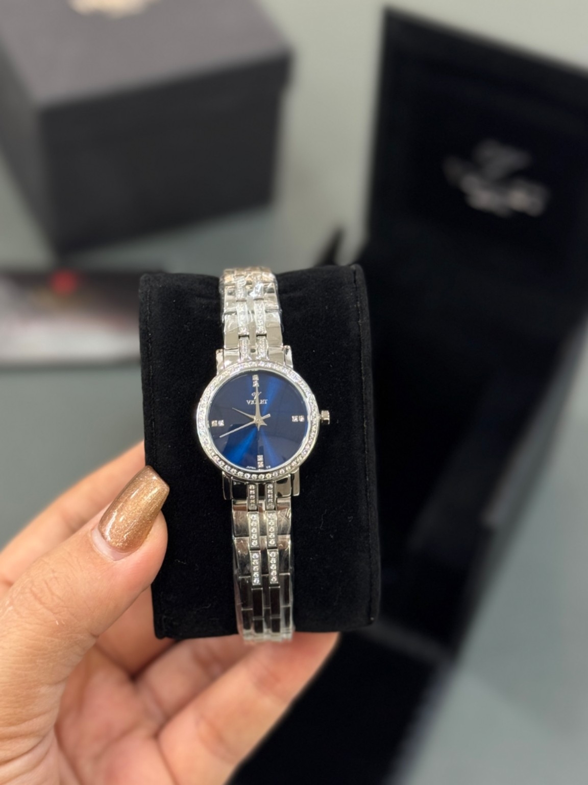 ساعت مچی زنانه ویولت با بند و قاب استیل و موتور ژاپنی در یک رنگ در گالری موجود است . ایندکس های و بند این ساعت با نگین کار شده.